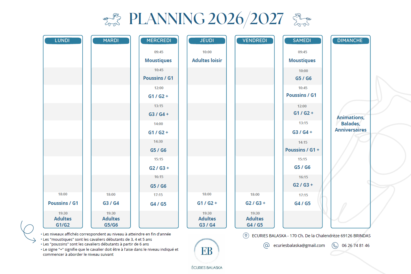 Au programme : cours collectifs hebdomadaires, cours particuliers, balades en famille à cheval, baptêmes poneys, anniversaires …